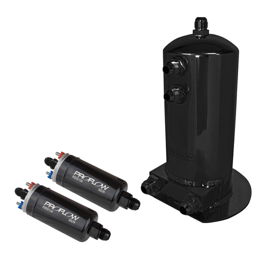 Proflow Fuel Surge Tank & Pump Kit Fabricated Aluminium, 254mm x 108mm, 2.5L, 2x 044 style pumps, Black Anodised