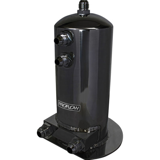 Proflow Fuel Surge Tank Fabricated Aluminium, 254mm x 108mm round, 2.5L, AN Fitting Kit, Black Anodised, Dual Outlets