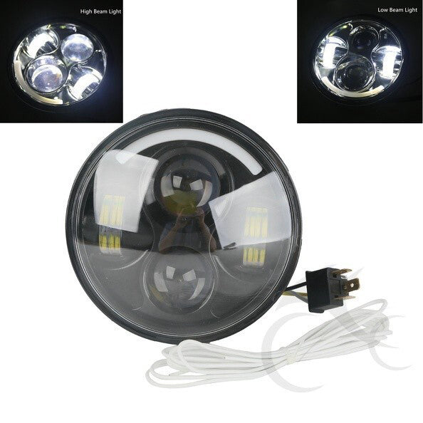Features: - Headlight Type: Aftermarket LED Headlight, black inner bezel. - Material : Black die-cast aluminum housing,clear PC lens. - Dimensions: 5.6 inch. - This head lamp is H4 connector. - Designed with Hi-Low beam and out put voltage can be 9-100V.